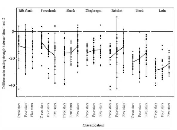 Figure 2: Relative decrease of the shear force value during the wet maturation process1 of the meat samples, by cuts and classification.
