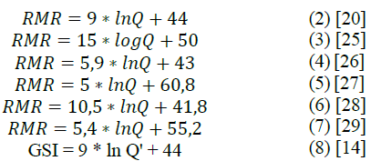 The equation with the highest correlation coefficient is that of Rutledge and Preston (eq. 4) [26], with 0.81. Naturally, studies tend to focus on the search for the correlation between RMR and Q-systems, due to their greater applicability to the branches of rock mechanics for excavations in both the open and underground. It should be noted that the systems have full application in surface projects, such as excavation and stabilization of rock slopes, in this case with emphasis on RMR and GSI, but without excluding the Q-system. However, it is for application to underground excavations that the correlations were developed and, based on this, more data on comparative studies between the Q and RMR systems exists for underground excavations.