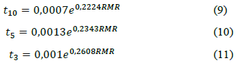 Considering the RMR self-support time graph and RMR values inferred from Q (eq. 2), the excavation self-support times, in hours, were simulated for excavation rates of 10, 5, and 3 meters. The automation of the calculation of the self-support times for these advances was performed by adjusting exponential equations, in this case, those with the highest correlation, to the graph of self-support times.