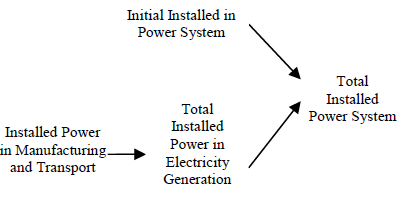 A flow chart of the model described below is presented in the Fig. 5, first the initial conditions [TN] production, installed power in [MW] defined initial population. Then it proceeds to calculate the increase in installed capacity by investments in each sector of the system, according to the criteria of load factor. It can be calculated production increase needed to cover the manufacture, installation, maintenance of new production facilities, expansion of power supply and generation. actual production in fossil resources system is calculated and extracted a balance between extracted resources, necessary resources is done to meet the demand and production capacity installed, thus determining the export / import of materials. From stage [k], the installed growth rates and demanded of the production sector are determined, thus obtaining the installed power, demanded and demanded satisfied. Defining a rate for excess or deficiency of demand, net imports are obtained. Residential energy consumption growth is determined. Power Demand Growth Power System (with losses).