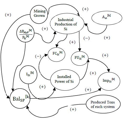 A causal diagram of the growth model is presented in the Fig. 4. Si is the sector i, depending on the item being analyzed. The main factor influencing the production system is the availability of fossil resources whose extraction curve follows a trend called 'Hubbert Peak Theory'. Therefore, it is acceptable to consider that the growth sectors of extraction of fossil resources and mining are the main factors that determine the growth of the system. No feedback on them is assigned as the currently available extension stocks are searched in order not to accelerate premature exhaustion.