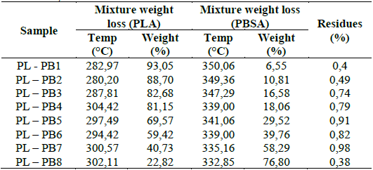 The Table 5 summarizes the thermogravimetric analysis results on the mixtures PL-PB1 to PL - PB8 with specifications indicated in Table 2. The table shows weight loss temperatures and the percentage of waste that remains after the mixture's thermal degradation. Regarding PLA weight loss; As the temperature increases, weight loss decreases ascribing to the PLA; however, the percentage of residues increases since it is attributable to the catalyst that has not reacted.