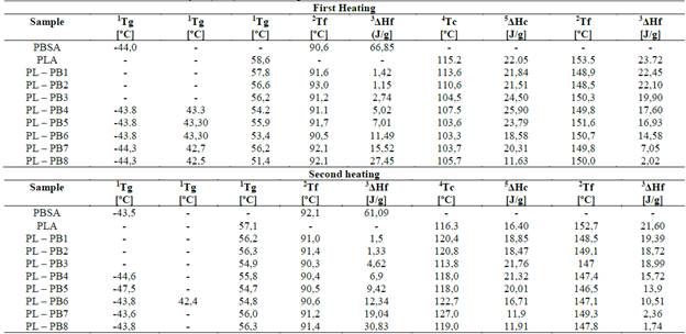 The tables show that adding low amounts of PSBA has high crystallization temperature (see Table 6); however, the crystallization enthalpies are somewhat dispersed, the PL-PB4 sample has a high enthalpy of crystallization and a temperature of 107.5 °C; this means that the addition of PBSA gives it a more significant crystalline character attributed to the fact that PBSA is semi-crystalline. Another important characteristic observed in the data obtained is that crystallization enthalpies, when cooled, are slightly lower than those from the first heating, which indicates that the PBSA in the mixture with the PLA does not crystallize effectively because the PLA being amorphous influences the crystallization of the mix. Furthermore, as the amount of PBSA in the mixture decreases, the fusion temperatures (Tf) in the first heating are slightly higher than the second heating; these characteristics may be attributed to the thermal properties of the PBSA (especially the melting point) are lower compared to the PLA