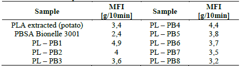 Table of results for the MFI of mixtures PL - PBSA extracted (potato) Source: The author.