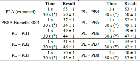 Table 7 details the flow index results applied to the dosages PL - PB1 up to PL - PB8. The analysis compared to undosed polymers (extracted) PLA and PBSA (bionelle 3001); This procedure shows fluidity index of the samples have higher values (greater than 3.4 g/10min) than the undosed polymers; this is due to the dosages contained in crodamide VRX, which influences increasing the fluency index.