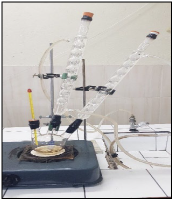 The lactic acid obtained was polymerized by the ring opening method (ROP) [24], which consisted of taking 100 ml of lactic acid and adding 5 ml of sulfuric acid as a catalyst 60% at temperature of 80 °C for 30 min under stirring, all this in an improvised polymerization experimental system (see Fig. 4). It was left to react for a time of 9 hours and in each lapse of two hours was added 5 ml of sulfuric acid and it was increased to a temperature of 120 ° C whit the objective to obtain the transformation of the dimer lactide.