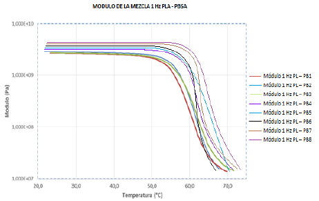 Fig. 8 shows the analysis DMTA of the dosages, which represent the hardness analysis "Shore" D. The following graph shows that as the PBSA increases in the mixture module E increases with temperature (see Fig. 8). This figure also shows that at temperatures above 50 ° C the samples PL - PB2 up to PL - PB8 are slightly higher than the PL-B1sample. In general, the PBSA increase is observed in the sample giving it a viscoelastic character; also observed that in temperature ranges of 50 and 60 ° C, a slope is mainly influenced by the decrease in PLA presence in the mixture