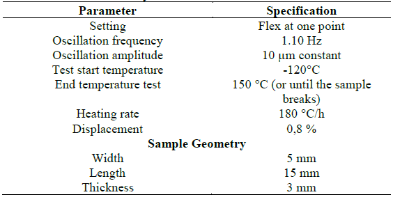 The test objective is to know the polymeric materials' properties such as glass transition temperature and temperature as a function of frequency expressed in stress curves, characterized by the polymer chain's molecular movement [33]. In this test, a sinusoidal deformation at a constant amplitude is applied, and frequency modulates with respect to time, and from the response sample, a complex modulus can be obtained [34]. The tests were carried out with a Tritec DMTA model 2000 DMA equipment (Triton Technology), applying the conditions shown in Table 4. Also, the geometric measurements that the sample had for this analysis are specified in the same table.