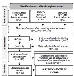 Articles published in scientific databases in Spanish, English and Portuguese were included, in order to have a greater informative scope. The year of publication was considered from 2011 to 2021. It is worth mentioning that the search was conducted from March to June 2021. In the ProQuest database, scientific journals were considered as the type of source; in EBSCO, journals and academic publications; in ScienceDirect, Research articles as shown on Fig. 1. descriptive and experimental studies were included in order to have studies that evaluate and apply at least one of the variables of this research as a reference.