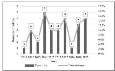 Fig. 2 shows that the largest number of articles were selected from the year 2014, representing 17.5%, followed by articles from 2020, with 15%. In addition, it is observed that the same number of articles were selected from the years 2012, 2015 and 2016, with 5 articles each, representing 10%; with a smaller amount in the years 2018 and 2011, with 1 article each, representing 2.5% of the total.