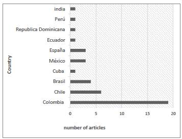 In Fig. 3, the largest number of articles comes from Colombia (47.5%), followed by Chile (15%). The Dominican Republic, Cuba, Ecuador, India and Peru have the lowest percentage, with one article each (2.5%).