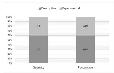 In relation to the type of study, as shown in Table 1, we have the following: 24 out of the total of 40 articles are descriptive (60%) and a smaller number are experimental (40%). This type of publication will allow us to observe the analytical results of case studies related to the variables chosen, see Fig. 4.