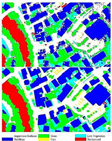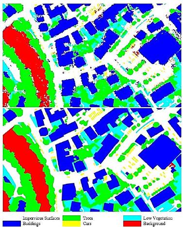 We obtained an OA value for the classification of 87.02%. The land-cover classes with the highest thematic accuracy (F1-score) ate Buildings, Trees, Background and Impervious Surfaces with92.92%, 91.56%, 83.83%o 83.80%, respectively. Moreover, we found that the lowest values of the F1-score were presented in the Cars and Low Vegetation classes, with values 52.89% and 71.64%, respectively.
