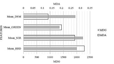 From 30 calculated object features, a set of 17 features was selected as the most optimal, considering that RFE chose this number of features based on the best accuracy result among all possible features subsets, and in this subset, the importance indexes of each feature were calculated. Fig. 6 shows that the most relevant object feature was MeanNDVI and MeannDSM. These attributes presented differences in importance index values regarding the other attributes of 0.15 (MDA) and 4160 (MDG) for Mean NDVI and of 0.09 (MDA) and 3560 (MDG) for MeannDSM. Otherwise, the object features with the lowest performance were those of GLCM texture. Only 6 of the 14 calculated ones were selected for the final classification, and these six presented the lowest performance. These results support the findings from the study by Aguilar et al. [45] and Aguilar et al. [46], whose objective was to demonstrate the VHR images potential to classify urban land-covers through different classes of variables, and where it was established that the spectral indexes and the relative heights to the ground (OA=83.6%), help to better classify the urban land-covers, in comparison with the texture measurements (OA=77.9%).