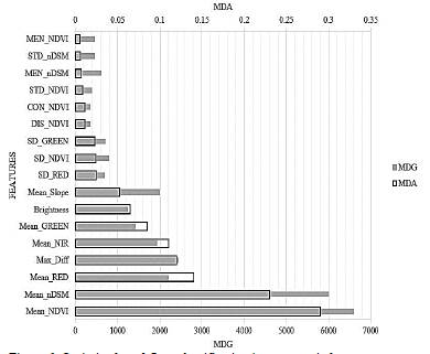 We found that the best result was obtained with the RFE algorithm with an OA = 86.84% and a feature set size of 17. Next, we evaluate the performance of the selected attributes as shown in Fig. 6, where the attributes with the highest incidence in the classification were Mean NDVI and MeannDSM.