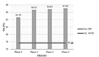 Fig. 8 shows the variation of the OA increase of the workflow as each phase was optimized. Starting from the OA reference of the non-optimized workflow (77.68%), successive increases in OA were observed as each phase was optimized, with values 6.91%, 2.04%, 0.21%, and 0.18% for phases 0, 1, 2, and 3, respectively.