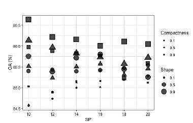 We obtained 54 possible combinations of hyperparameters. The best result was obtained with the values of SP = 10, Shape = 0.9, and Compactness = 0.9 with an OA = 86.63%.