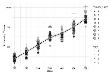 The RF hyperparameters optimization found that in the 224 combinations performed; the OA had a maximum variation of 0.19%. Therefore, it was demonstrated that RF is a robust ML method that is not affected by its performance by the hyperparameters adjusting [25,47]. However, we found that this setting improved the workflow processing time, especially the ntree setting. Fig. 10 shows that the processing time can be up to four times longer, depending mainly on the value of ntree. This result confirms the finding of Probst et al. [48], where after a certain ntree value, the OA stabilizes so that an increase of this kind only increases the processing time. Conversely, for mtry and min.node.size, no indication was found in the results confirming the increase in OA suggested by Probst et al. [48].