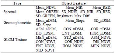 The features or attributes calculated for each object output by the segmentation phase correspond to the textural type (GLCM); geomorphometric (DSM, nDSM, and Slope), and spectral (TOP, NDVI, Max.Diff, and Brightness), as shown in Table 3. Max.Diff and Brightness were calculated according to the terms of [34].