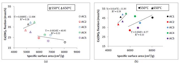 The AC4 and AC3 clays showed the highest fixation percentages at 7 days when were calcined either at 550 °C or at 650 °C, while the AC2 and AC5 had the lowest fixation percentages (Fig.4a). The kaolinite and dickite content would explain the pozzolanic activity of these clays, as the higher kaolinite group minerals content in the raw clay, the higher calcium hydroxide fixation; however, when are included other clays that correlation is not good enough, based in R2 value (Fig.4c).