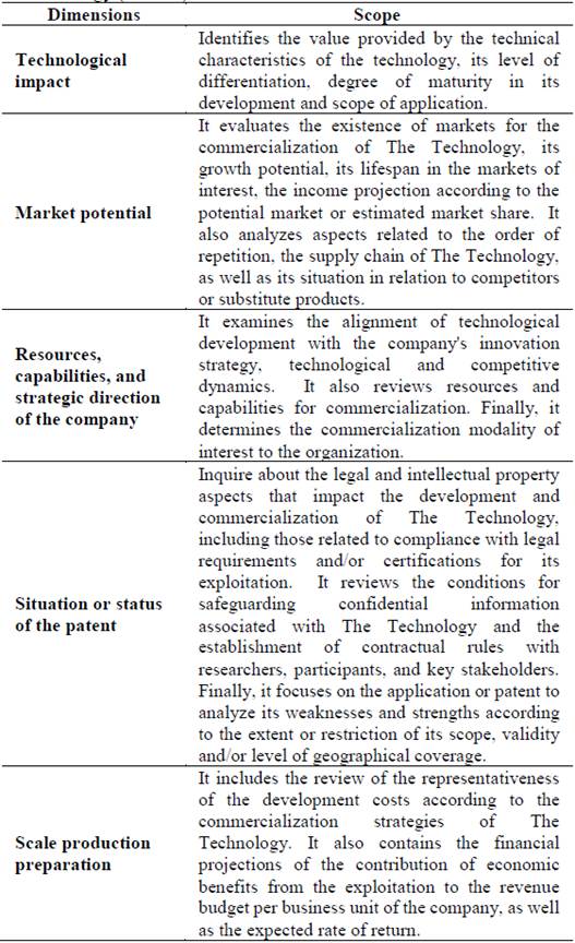 The Table 1 shows the definition of the dimensions proposed to evaluate the conditions and potential of a technological or invention patent.