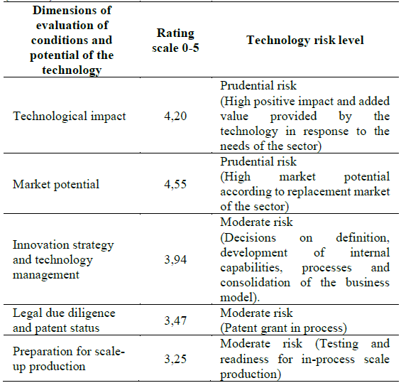 The technological, legal and financial factors related to the market potential of the technology, its evaluation horizon and exploitation expectations, allow laying the foundations for the valuation. Thus, a situational diagnosis of the conditions and potential of The Technology was made by applying an evaluation questionnaire with 5 impact dimensions: i) technological impact, ii) market potential, iii) technology and innovation strategy, iv) legal due diligence and patent status, and v) readiness for scale production.