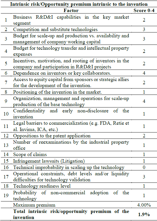 Subsequently, we proposed and applied a scoring methodology according to business conditions and those of the patent holders in order to determine a Risk Factor (RF) that would then be incorporated into the cost of capital, also called discount rate when valuing the transfer alternatives. For this valuation exercise, we consider two transfer scenarios or alternatives: i) the internal production and distribution by the company itself, which is the one initially preferred by the patent holders, and ii) the licensing alternative. Finally, the results are discussed in the light of the literature on Intellectual Property Management and R&D and patent valuation, presenting some technical guidelines to be taken into account.
