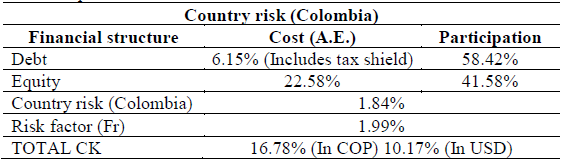 The investor's opportunity interest rate Kp was calculated based on the eqs. (3) and (4), considering the Colombian risk premium Rc equal to 1.84 % [22] and that Fr equal to 1.9 % is the risk factor calculated with our scoring methodology according to opportunity and intrinsic potential of the invention, shown below in Table 4.