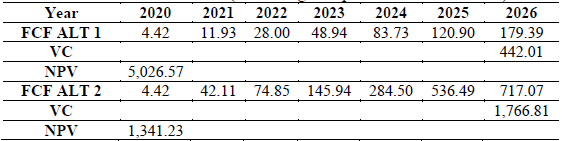 The growth in demand for internal production and own distribution is expected to double in the first two years, to stabilize in the following four years, and then begin to decline by 15 % until the patent life is over. The projections of free cash flow, continuity value limited to the useful life of the patent (15 years), as well as the net present value of each alternative are shown in the Table 6.