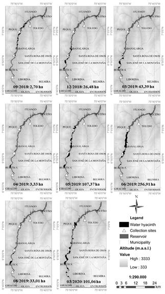 Structuring management plans for these species requires data on their spatial and temporal distribution, which locates populations and allows the evaluation of the appropriateness of regulatory methods. In large areas, this information can be acquired and monitored through the analysis of multi-temporal remote sensed data with Geographic Information Systems (GIS). We follow this approach in this study to analyze the spatio-temporal distribution patterns of P. crassipes in the reservoir of the Ituango Hydroelectric Project (IHP). The IHP is the largest infrastructure project currently underway in Colombia, with a reservoir consisting of 3812 [13] ha of flooded area, and a projected capacity of 2400 MW [13]. The results presented here are based on the analysis of multispectral data derived from Sentinel-2 MSI, including several Vegetation Indices (VIs) to evaluate their performance in the discrimination of P. crassipes, between September 2018 and March 2020. Therefore, this study contributes to the development of methodologies aimed at enhancing the monitoring of water hyacinth in large reservoirs, and to the formulation of better management strategies.