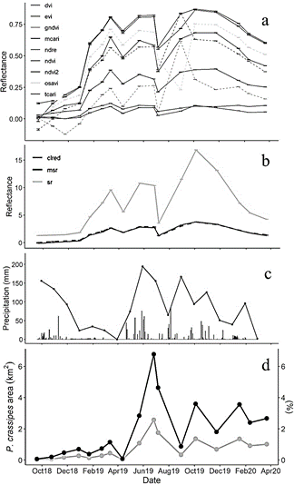 P. crassipes cover was positively correlated with VIs (Table 4), with significant values mainly at 1 and 3-month lags. The higher correlations were obtained for 1-month lags with indices Cl red edge, MSR, NDVI, EVI, and NDVI2, with VIs leading water hyacinth behavior. Correlations for the same month were statistically significant only for NDVI and NDVI2. In Figs. 6c and 6d, the behavior of P. crassipes was similar to monthly precipitation time series, but it had an apparent delay, with increased water hyacinth cover occurring after periods of higher precipitation. This coincides with the correlation between precipitation and P. crassipes cover at a 1-month lag, with P. crassipes expansion periods occurring during months after increased monthly precipitation.