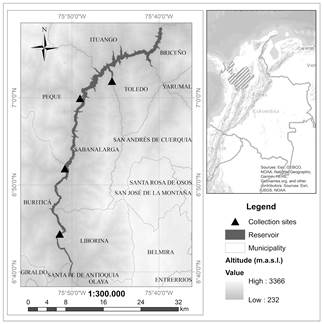 The IHP is in northwestern Antioquia at 170 km by road from Medellín, and 8 km downstream of the Pescadero Bridge. The reservoir is situated within latitude 07° 08ʹ 10.00ʹʹ N to 06° 39ʹ 22.71ʹʹ N and longitude 75° 52ʹ 35.56ʹʹ to 75° 39ʹ 33.35ʹʹ W; it covers 3812 ha with a longitude of 77.1 km and occupies areas in municipalities situated on the left bank (Santa Fe de Antioquia, Buritica, Peque, and Ituango) and on the right bank (Liborina, Sabanalarga, Toledo and Briceño) of the Cauca River [14] (Fig. 1). The intra-annual (interannual) climatic variation in the study site is dominated by the dynamics of the Intertropical Convergence Zone - ITCZ (El Niño Southern Oscillation - ENSO). The ITCZ leads to increased (reduced) precipitation in June - July (November - March), whereas the ENSO warm (cold) phase results in decreased (increased) rainfall. The study site has an average annual precipitation of 1350 mm, and an average temperature of 26.7°C (based on several climate stations around the reservoir), whilst the water body has temperatures that range from 25.7 to 28.1°C [14]. Two life zones [15] converge in this area: tropical dry forest (bs-T) and tropical humid forest (bh-T).