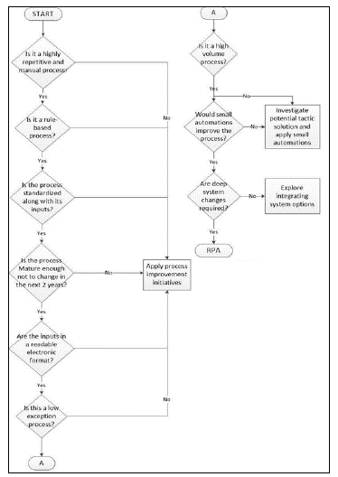 Defining, a process model, implies lots of structuring work, e.g., relevant business activities and events must be identified and named, the order of these activities must be well defined, and business logic and critical activities must be specified within an organized and structured scheme. However, this discovery process can also be automated and oriented by a new "Process Mining" paradigm involving artificial intelligence, self-learn algorithms, simulation, and data science to extract knowledge and process structure. Process mining comes from using data mining on data generated while executing business applications. This way, design and extract the correct logic that depicts the business and optimize the process [25]. Process mining uses data to automatically build an as-is process model and improve the efficiency as well as speed in this critical step of the automation [23]. It can be questioned whether the process models obtained by process mining are equal to hand-crafted models regarding their quality because process mining can only be applied when an appropriate data log is available and may omit phrases that are not data-driven. Suppose your process discovery is supported by data, simulation, and mathematical analysis and is away from the employees' judgments. In that case, it can be a good candidate for process mining and possibly competent to develop a successful RPA.
