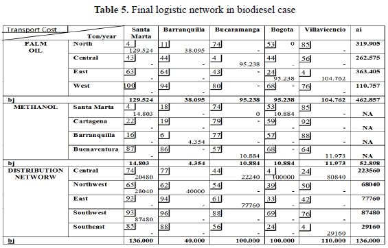 According to Figures 1 and 2, five scenarios were considered in the biodiesel production case. The plants in Santa Marta and Cesar were grouped in one place and other plants were individually analyzed. The central, northwest, east, southeast and southwest of the country were taken into account in the analysis of biodiesel distribution network (see figure 3).