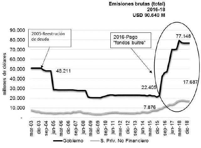 Otro rasgo importante para entender el aumento acelerado de fragilidad externa es que la segunda fuente de financiamiento fue la emisión de deuda pública y privada en los mercados internacionales impulsada por el fin del conflicto del Estado argentino con los houldouts. El 23 de abril de 2016, la administración nacional pagó la totalidad de la sentencia dictada por el juez Griesa de 9300 millones de dólares mediante la emisión de nueva deuda. Tal acción dio por finalizada los embargos que imposibilitaban la colocación de deuda en los mercados internacionales, un aspecto clave para sortear los limites del estrangulamiento externo que enfrentaba la economia argentina.