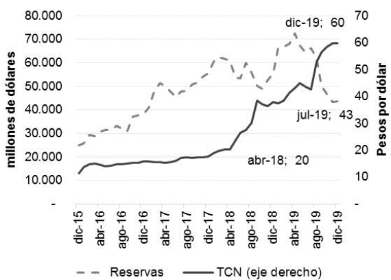Figura 6: Dinámica de reservas y tipo de cambio (diciembre 2015 a diciembre 2019)