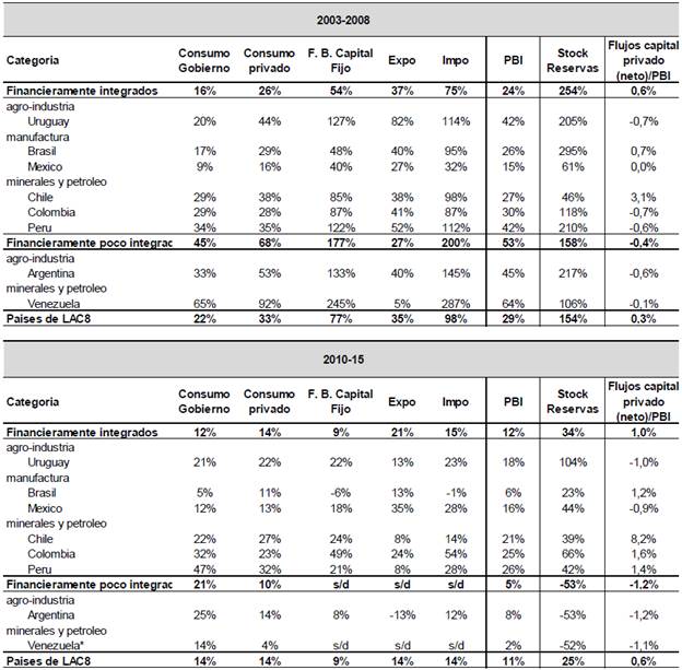 Nota: PBI, tasas de crecimiento promedio para el periodo, cuenta corriente y flujos de capital privado como suma del resultado neto acumulado del periodo, stock de reservas como variación punta a punta. Las categorias de integración financiera (financieramente integrado y poco financieramente integrado) tomadas de CEPAL (2019). Valores totales de categorias expresadas en suma de promedios ponderados según el peso de cada pais en el total. Para el periodo 2010-15 información detallada de algunas variables no está disponible para Venezuela. Fuente: elaboración propia a partir de Cepal (2019).