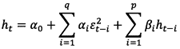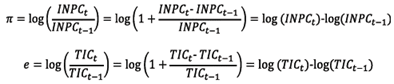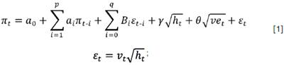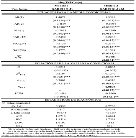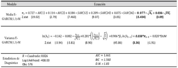Las ecuaciones [1] y [2] son el modelo SARMA (con componente estacional), y el modelo E-GARCH-M, respectivamente. A la primera ecuación se le incorporó la desviación estándar condicional de la inflación y la volatilidad cambiaria; en tanto que a la segunda, se le agregó la inflación rezagada un periodo.