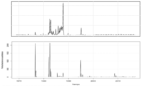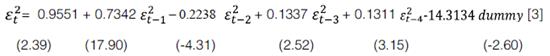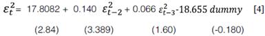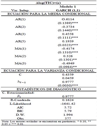 Los resultados de la estimación se desarrollan mediante el método de Cuasi Máxima Verosimilitud (QML). La mayoría de los estimadores son estadísticamente significativos al 1%, tanto para la media como para la varianza condicional (modelo 1 y 2). También se aprecia que en el modelo 2 la inclusión de la variable DUM (dummy) es negativa y estadísticamente significativa al 5%, con lo que se puede establecer la existencia de un efecto negativo de los choques estructurales de 1981, 1988 y 1999.