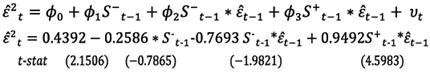 Dado que la hipótesis nula de no sesgo de signo y tamaño es H 0 = Φ 1 = Φ 2 = Φ 3 = 0. Aunque $i = -0.2586 no es estadísticamente significativo, el tamaño o magnitud de los choques Φ 2 = -0.7693 y Φ 3 = 0.9492 si presentan significancia estadística. Con base en estos resultados se deben estimar modelos asimétricos no lineales para capturar de forma adecuada la incertidumbre inflacionaria, específicamente el modelo E-GARCH-M.