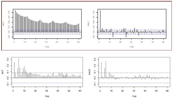 La primera fase para modelar la incertidumbre o la volatilidad en una serie de tiempo es especificar una ecuación adecuada para la media condicional de (ϖ) y de (e). Dada la ausencia de un modelo estructural de aceptación generalizada para el cambio porcentual de la inflación y del cambio porcentual del tipo de cambio, las especificaciones autorregresivas y de medias móviles tanto ordinarias como estacionales, se han vuelto populares en la literatura empírica. En el Gráfico 2 se pueden identificar los patrones que siguen los procesos estocásticos, y de esta manera, proponer el modelo SARIMA adecuado para ambas series de tiempo. De acuerdo con la literatura especializada un patrón decreciente en ambas funciones evidencia un modelo con componentes tanto autorregresivos como de medias móviles. Adicionalmente, se aprecia una marcada variación estacional, la cual está presente en el duodécimo mes de los primeros años.