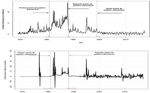 Gráfico 4: Cambios estructurales en la inflación y el cambio porcentual del tipo de cambio