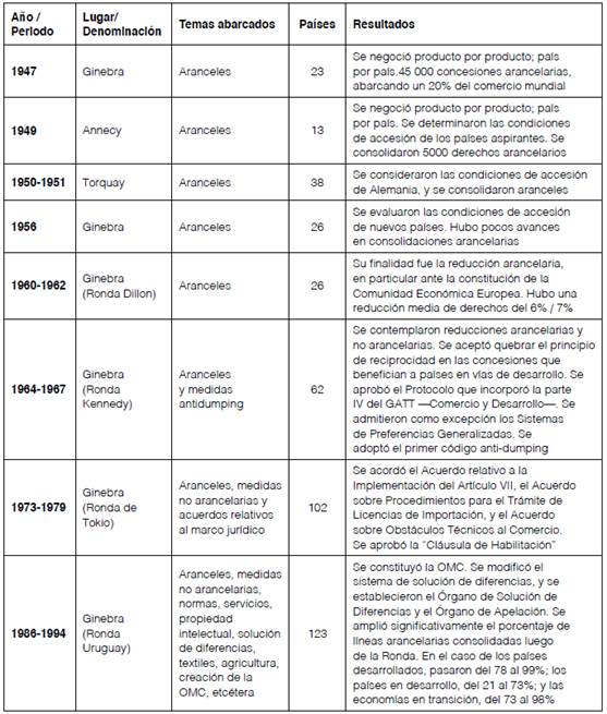 Como es posible observar en el cuadro 1, en el periodo de vigencia del GATT de 1947 (19481994) se amplió significativamente la cantidad de Partes Contratantes, y se lograron nuevos compromisos a partir de sucesivas rondas de negociaciones. Las primeras cinco rondas, que se desarrollaron entre 1947 y 1961, tuvieron como eje central la reducción de aranceles. Posteriormente, se extendieron los temas abarcados: la Ronda Kennedy (1964-1967) se focalizó en aranceles y medidas antidumping, y la Ronda de Tokio (1973-1979) abordó además de la cuestión arancelaria, medidas no arancelarias y otros temas jurídico-institucionales.