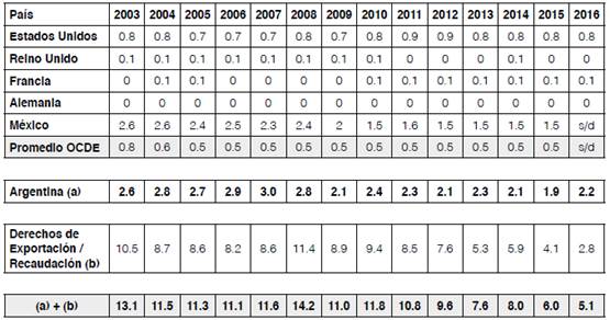 Esto, tal como es posible observar en el cuadro 2, no sucedió en el caso de la Argentina. A modo de ejemplo, los derechos y cargas sobre la importación oscilan entre el 2% y el 3% del total de la recaudación entre 2003 y 2016; pero si a esto le adicionamos los derechos de exportación8, tenemos una dimensión más acabada del peso que tienen este clase de tributos: en igual periodo explicaban, en promedio, el 10% de los ingresos públicos; aunque con una tendencia a la baja en los últimos años.