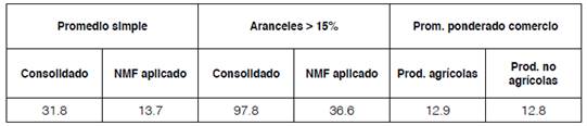 Dados los compromisos asumidos por la Argentina y su comercio en 2016, resulta relevante efectuar ciertas consideraciones respecto a la estructura arancelaria vigente. Como se indica en el cuadro 3, el promedio simple de los aranceles -consolidados- es del 31.8%, mientras el arancel NMF aplicado es de 13.7%; los aranceles mayores a 15% representan el 97.8% de las posiciones consolidadas, y solo el 36.6% de los aranceles NMF aplicados. Si se examina el promedio ponderado de los derechos aplicados por comercio, el arancel es del 12.9% en el caso de los bienes agrícolas, y del 12.8% en el caso de los bienes no agrícolas. Por otra parte, los productos textiles y las prendas de vestir, catalogados usualmente en el país como "sectores sensibles", se arrogan los mayores niveles aranceles, 23.3% y 35%, respectivamente (OMC, ITC y UNCTAD, 2017).