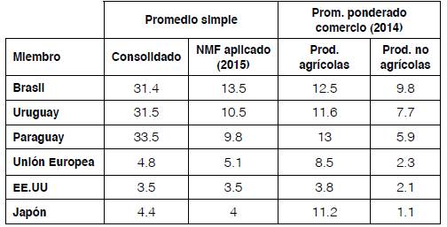 Cuadro 4: Aranceles consolidados y aplicados por los países del Mercosur (sin Argentina)14, EE.UU., U.E. y Japón