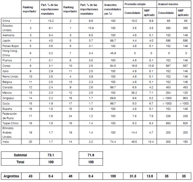 Por último, resulta importante subrayar que las Listas de concesiones de cada Miembro de la OMC guardan diferencias relevantes entre sí19, ya sea en términos de cobertura arancelaria; tipos de derechos consolidados; aranceles máximos; diferencias entre aranceles consolidados y aplicados; etcétera20. Esto puede observarse con cierto nivel de detalle en el cuadro 5, que incluye información al respecto de los principales 20 Miembros de la OMC en términos de su participación en el comercio mundial -que explican en conjunto casi tres cuartos de las exportaciones mundiales-. Esta "elite" consolidó la totalidad de su universo arancelario -con salvedades poco relevantes-, lo cual es indicativo de la profundidad de los compromisos asumidos21, aunque al interior de cada lista hay situaciones que llaman a la precaución22.