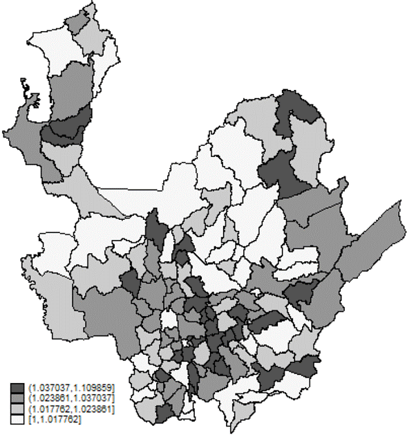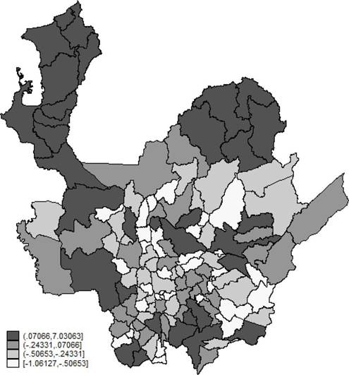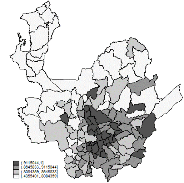Basado en los mismos anexos se construyó un indicador de alfabetización, medido como la proporción entre productores alfabetos y el total de productores agrícolas, un indicador de déficit de vivienda, calculado como el número de hogares por vivienda en el área rural dispersa y, finalmente, un indicador de la afiliación a salud subsidiada de los productores agrícolas, que se determinó como el cociente entre el número de productores agrícolas que cuentan con el régimen subsidiado de salud y el total de productores.