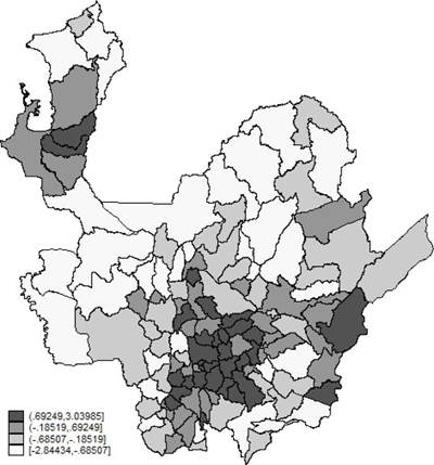 Para construir el índice se utilizó la técnica de componentes principales, mediante la cual se extrajeron tres factores con los cuales se estructuró una puntuación estandarizada y que refleja la posición relativa de un municipio. Es importante aclarar que el índice no evalúa si la agricultura de Antioquia es productiva, simplemente otorga una posición de cada municipio respecto al tamaño de su agricultura1.