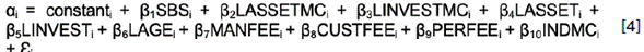 The above-mentioned univariate analysis does not take into account the effects of fund size, fund age, fees and type of management company on the relationship between a fund's financial performance and concurrent management. To overcome this, the effect of concurrent management on the performance of mutual funds and pension plans is set out in Equation [4]: